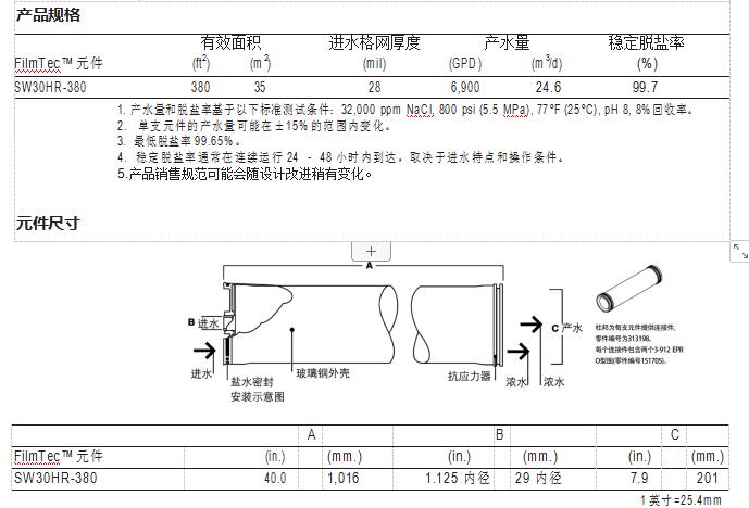 FilmTec™ SW30HR-380 元件是一款優(yōu)質(zhì)的海水淡化反滲透膜元件,它的有效膜面 積高、脫鹽率高,能為海水淡化系統(tǒng)帶來長期的最佳經(jīng)濟性。